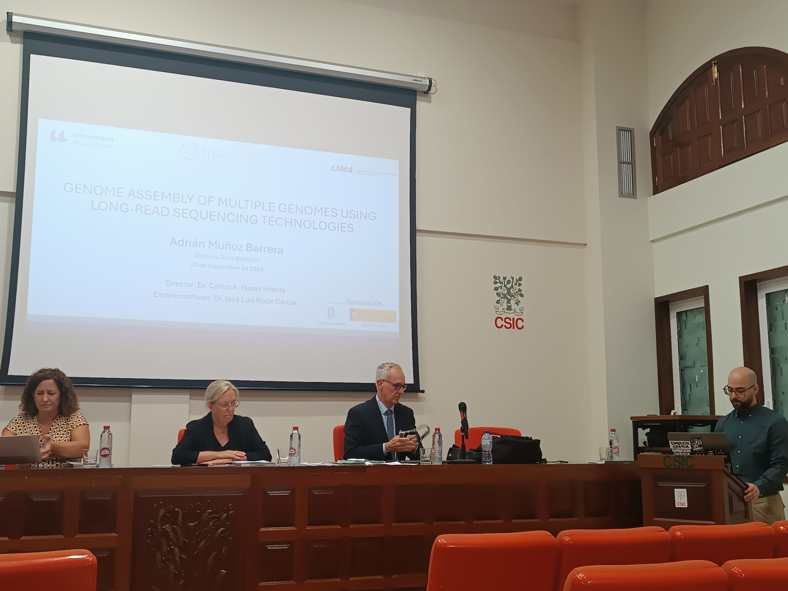 Como parte del programa de doctorado de Ingeniería Industrial, Informática y Medioambiental (I3MA) de la Universidad de La Laguna, la defensa de la tesis doctoral con título «Genome assembly of multiple genomes using long-read sequencing technologies» de nuestro compañero Adrián Muñoz Barrera tuvo lugar en el Salón de Actos del Instituto de Productos Naturales y Agrobiología, IPNA-CSIC, en la modalidad de compendio de publicaciones y con Mención Industrial. La tesis se desarrolló bajo la dirección de los doctores Carlos Flores (Director del Área de Genómica e Investigador de FIISC) y José Luis Roda (Profesor Titular de la Universidad de La Laguna). Esta actividad ha sido parte de los proyectos UDIGEN, financiado por el Ministerio de Ciencia e Innovación (RTC-2017-6471-1; AEI/FEDER, UE), cofinanciado por fondos FEDER «Una manera de hacer Europa» de la Unión Europea, y del Servicio de Análisis Masivo de Datos Genómicos, financiado por el Cabildo Insular de Tenerife (CGIEU0000219140).