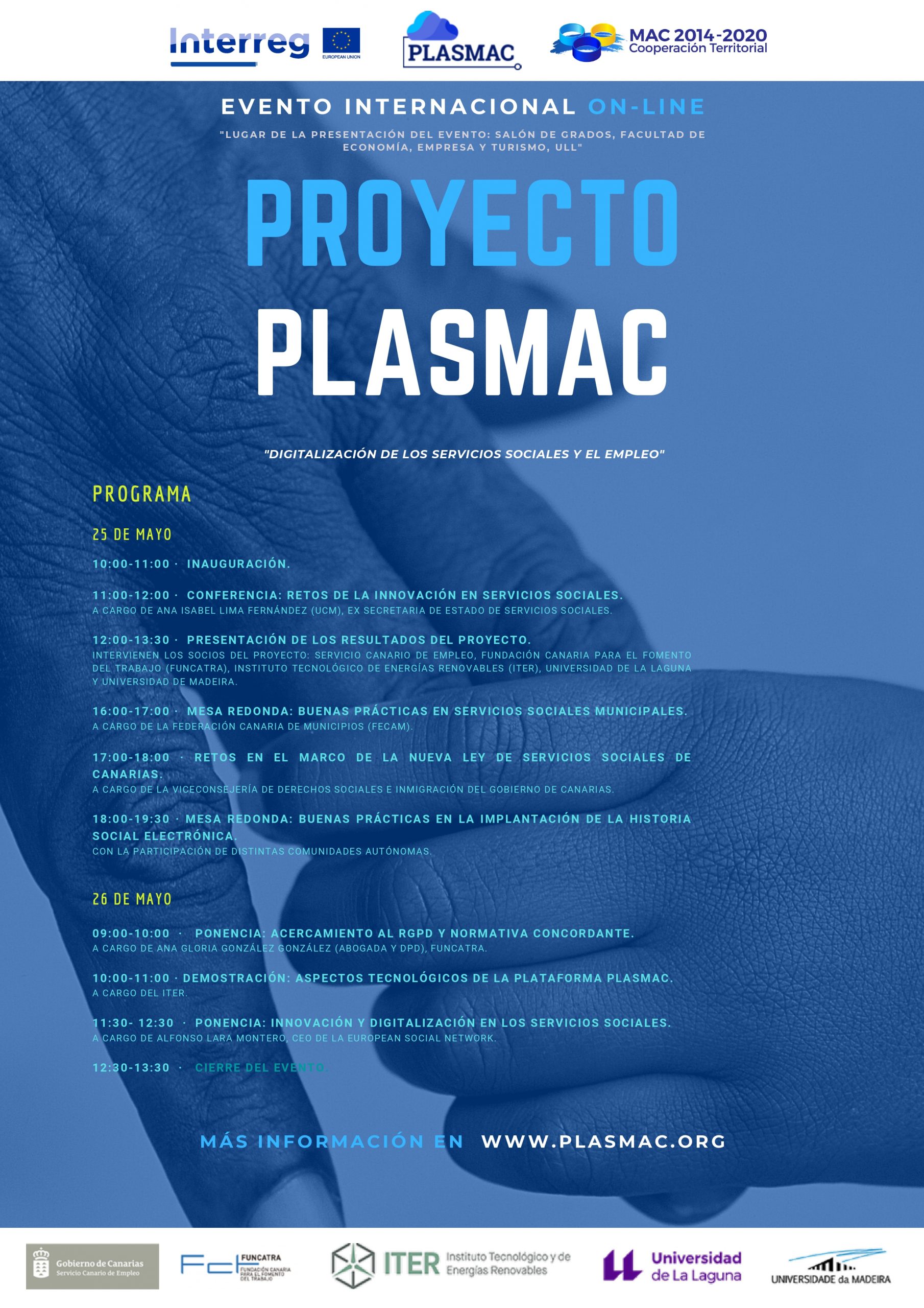 Los próximos días 25 y 26 de mayo de 2021 tendrá lugar el evento internacional online «Digitalización de los Servicios sociales y el empleo» organizado en el marco del proyecto PLASMAC – Plataforma en la nube para la mejora de la atención socio asistencial y la integración laboral en la Macaronesia .