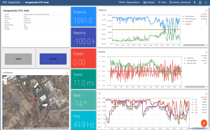 El ITER ha diseñado un sistema de adquisición, almacenamiento y visualización de datos que permite supervisar en tiempo real distintos parámetros de algunos de sus aerogeneradores, como la velocidad del viento, la producción de energía o los estados de operación. Esta información se centraliza en una plataforma digital, donde se puede consultar de forma visual a través de gráficos e indicadores que facilitan la detección de anomalías o problemas técnicos.