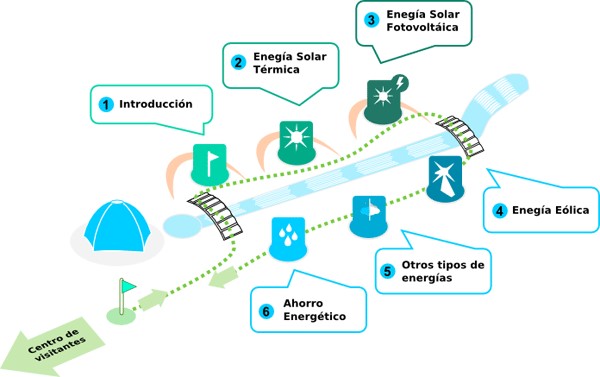 Las distintas características de la ruta de las energías renovables están ordenadas por temas. El motivo de su ordenación es puramente didáctico, comenzando por una introducción general a la situación del abastecimiento energético y una visión de conjunto de las fuentes convencionales y renovables, para seguir con un análisis más detallado de cada una de las renovables y terminar con un espacio dedicado a cómo puede implicarse el público en general para ayudar a resolver el problema del abastecimiento energético.
