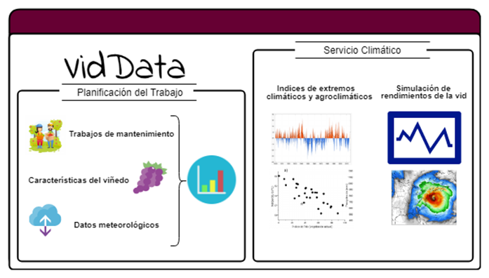 En respuesta a este problema, se presenta VidDATA. VidDATA es un servicio de soporte agroclimático que proporciona información climática de alta resolución, así como estimaciones de costes mediante Big Data y Machine Learning, para ayudar tanto a las aseguradoras agrícolas como al sector vitivinícola canario en la toma de decisiones y el desarrollo de estrategias de adaptación al cambio climático.